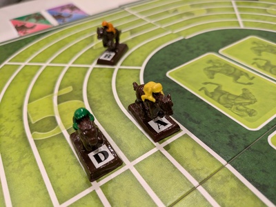 ちなみにこのゲームの最大の不思議なところは「馬のカード出た枚数で進むけど、偶数と奇数で片方は進まない」という仕組み。これによってプレイヤーのベクトルが見えたり見えなかったりする。
