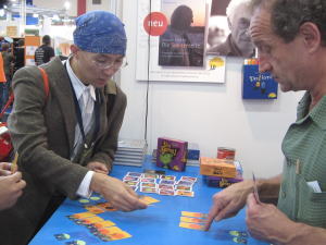 昼と夜をテーマにした簡単カードゲーム。おのさんと作者とプレイしましたが、簡単なドイツ語のインストのみでそのままプレイ。ゲーム中とにかくシステムを推測し、身振り手振りでプレイしていきます。出したカードが上手く繋がっていくようにしていくことが目的ですが、他人の邪魔を狙ってプレイしに行ったり出来ます。可愛い見た目とシステムの鋭さ。ドイツゲームの要素が詰まったような感じでした。ちなみにプレイ中おかしを色々頂き、最後にゲームまで頂きました。なんというアットホーム感。